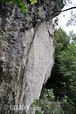 Mit 8 m nicht besonders hoch, aber durch das weit ausladende Dach, welches die gesamte Wand durchzieht hat man hier einige harte Boulderklettereien zur Verfügung. Aus den Löchern drückt das Wasser oft lange nach.