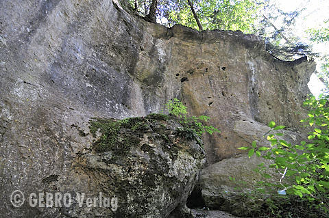 Gewaltiger und mächtig überhängender Felsklotz am Rande des Trockentales. Obwohl die löchrige Wand nur etwa 15 m hoch ist beeindrucken die steilen, löchrigen und fast durchweg sehr schweren Routen den Besucher mächtig. Leider ist die Wand oft lange nass.