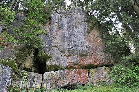 Nur 6 m bis maximal 10 m hoch ist dieser kleine Felsriegel am Rande einer Wiese. Aber auch hier ist die Überhangsneigung enorm ausgeprägt. Nur im äußerst rechten Wandbereich gibt es einige etwas leichtere Routen.