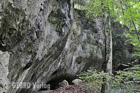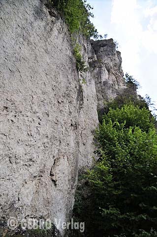 Eine dieser kuriosen Felsformationen wie man sie in Franken immer wieder findet. Gleich einer sich überschlagenden Welle zieht sich die 10 m hohe Wand den Hang hinauf, mächtig überhängend mit vielen mehr oder weniger guten Löchern versehen reiht sich hier Tour an Tour. Wirklich einfach ist hier nichts