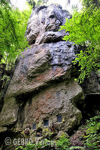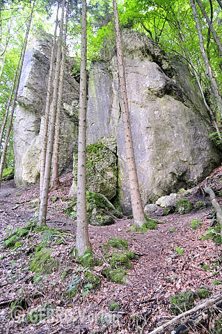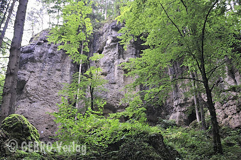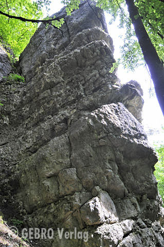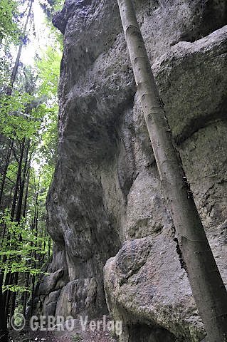 Gleich am Ortsausgang von Tüchersfeld steht die mächtige gut 30 m hohe Wand im dichten Wald versteckt. Hier gibt es kleingriffige Ausdauerrouten in meist leicht überhängendem Fels zu entdecken.