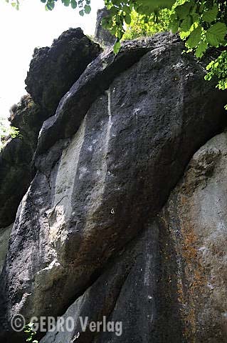 Mächtig überhängender 5 m hoher Dachriegel rechts, ohne den Vorbau eigentlich ein Boulder. Der linke knapp 10 m Wandbereich ist dagegen senkrecht und plattig.