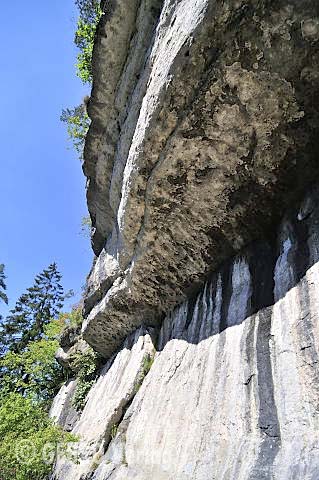 Gleich in Verlängerung des Weges kommt man zum Nebenfels der ebenfalls mit ziemlich überhängenden Routen glänzen kann. Auch hier gilt, die Wand ist oft und lange nass.