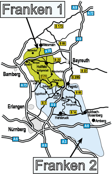 Unterteilung im Nördlichen Frankenjura(Nördlicher Teil • Northern part) - "Franken 1"(Südlicher Teil • Southern part) - "Franken 2" |