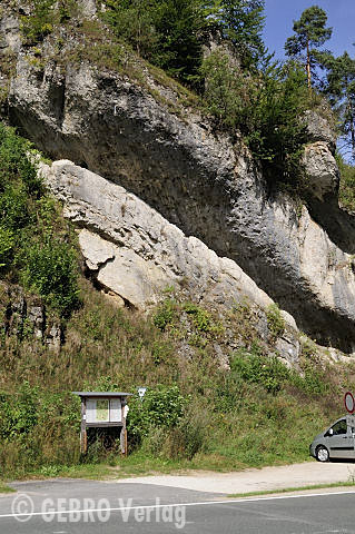 Noch so ein legendäres Wahrzeichen der fränkischen Kletterkunst. Direkt am Ortseingang von Obertrubach steht dieser originelle Fels an dem die Klettereien kaum über 8 m Kletterlänge hinausgehen. Das liegt daran, dass sich hier ein begehbares Felsband in perfektem Abstand zum darüber liegenden Dachriegel schräg steil bergauf zieht. Mit seiner Route "Stone Love" hat hier Jerry Moffat bereits 1988 ein - für damalige Zeiten - enorm hartes Frankenproblem geknackt das auch heutige, hallengestählte Nachwuchsprofis vor nicht unerhebliche Probleme stellt.