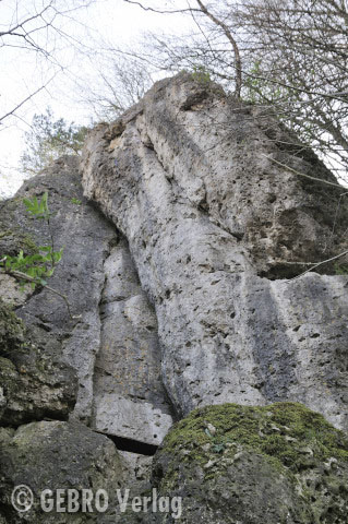 Kleiner, etwa 10 m hoher, kräftig überhängender Felsblock mit 2 schönen und gut gesicherten Routen in solidem Fels.