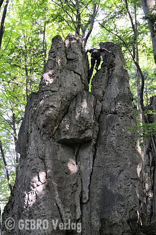 25 m hoher, mächtiger Felsbrocken mit einem leicht alpinen Touch. Die Routen sind gut aber häufig nicht gerade übersichert, Klemmkeile mitzunehmen ist kein Fehler.