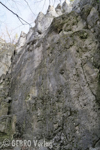 13 m hohe, senkrechte bis leicht überhängende Wand. Die Routen hier sind eher von der kleingriffigen Sorte, das Gestein macht einen soliden Eindruck